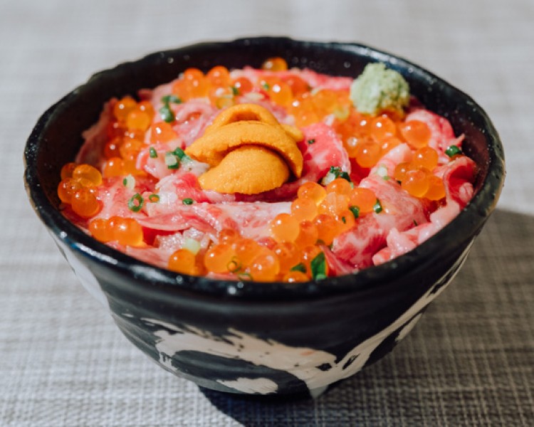 11.炙り牛トロ雲丹いくら丼 Broiled Beef Chuck Flap and Trout Roe Rice Bowl with Sea Urchin